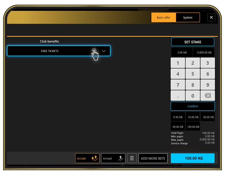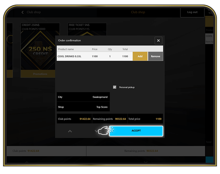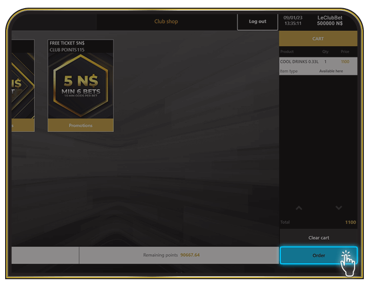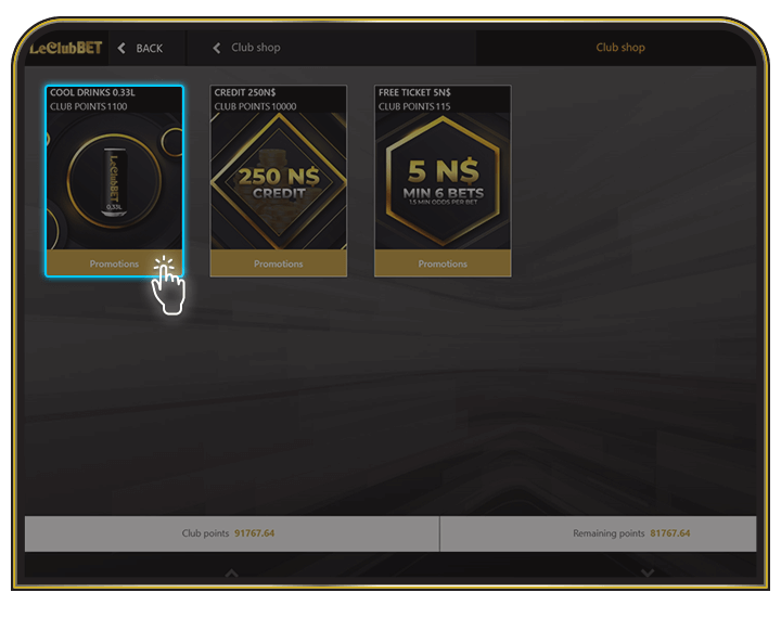 Club points are points earned by playing (placing) bets using terminals in one of our shops. After placing a bet/ticket, the user will receive points equivalent to the stake for that particular bet. If the user, for example, played a Sports bet with a stake of 5.00 N$, he would then receive 5 club points that can then be used to purchase one of the following: