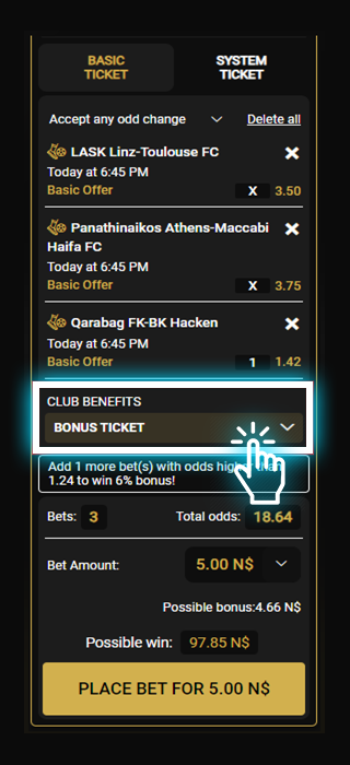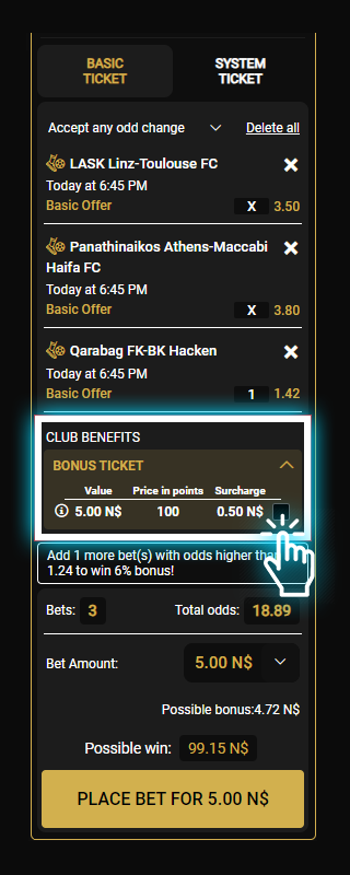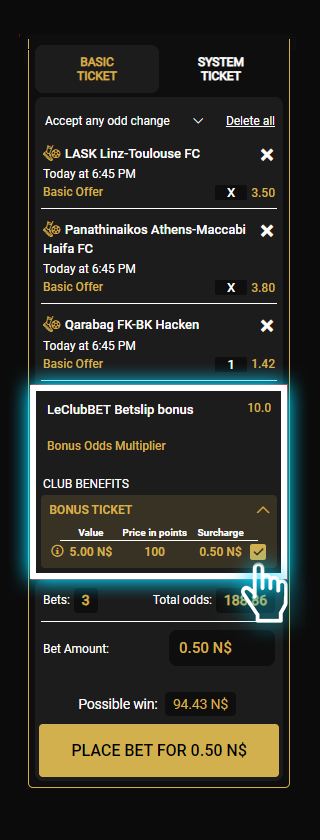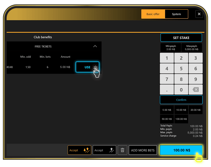 - Total ticket value will be displayed as 5 N$ but ONLY 0.50 N$ will be deducted from your account (0.50 N$ x 10 odds boost = 5 N$)